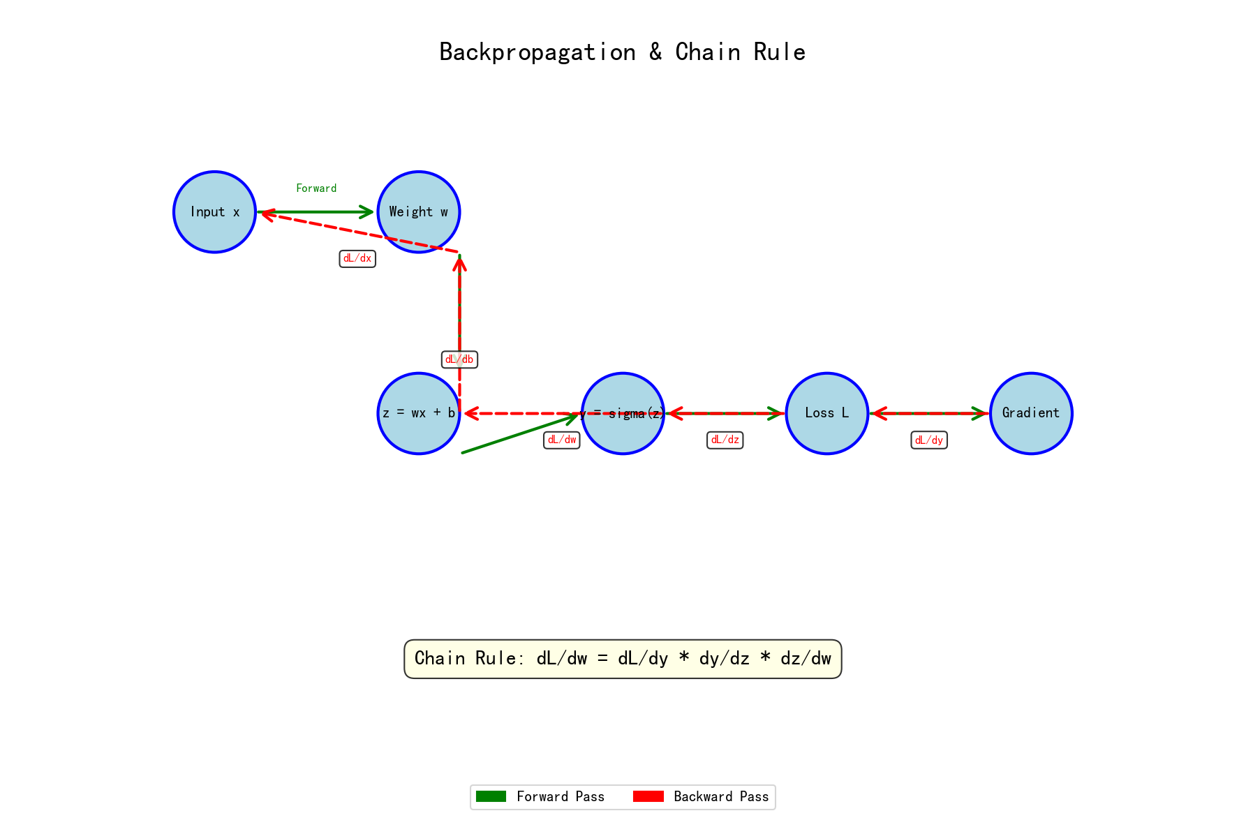 | 链式法则 | ∂z/∂x = ∂z/∂y · ∂y/∂x | 反向传播 |