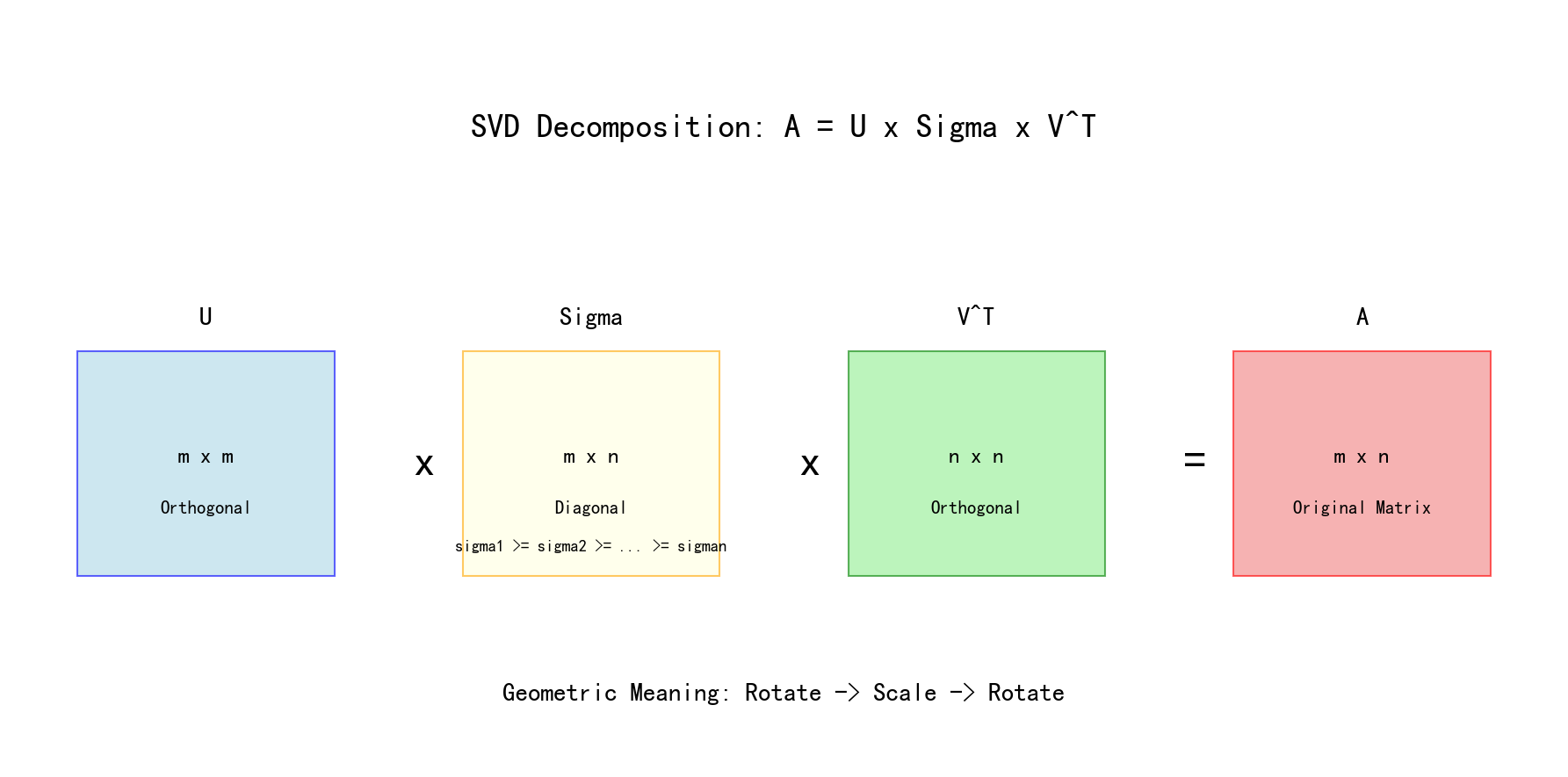 | SVD | A = UΣVᵀ | 降维、压缩 |