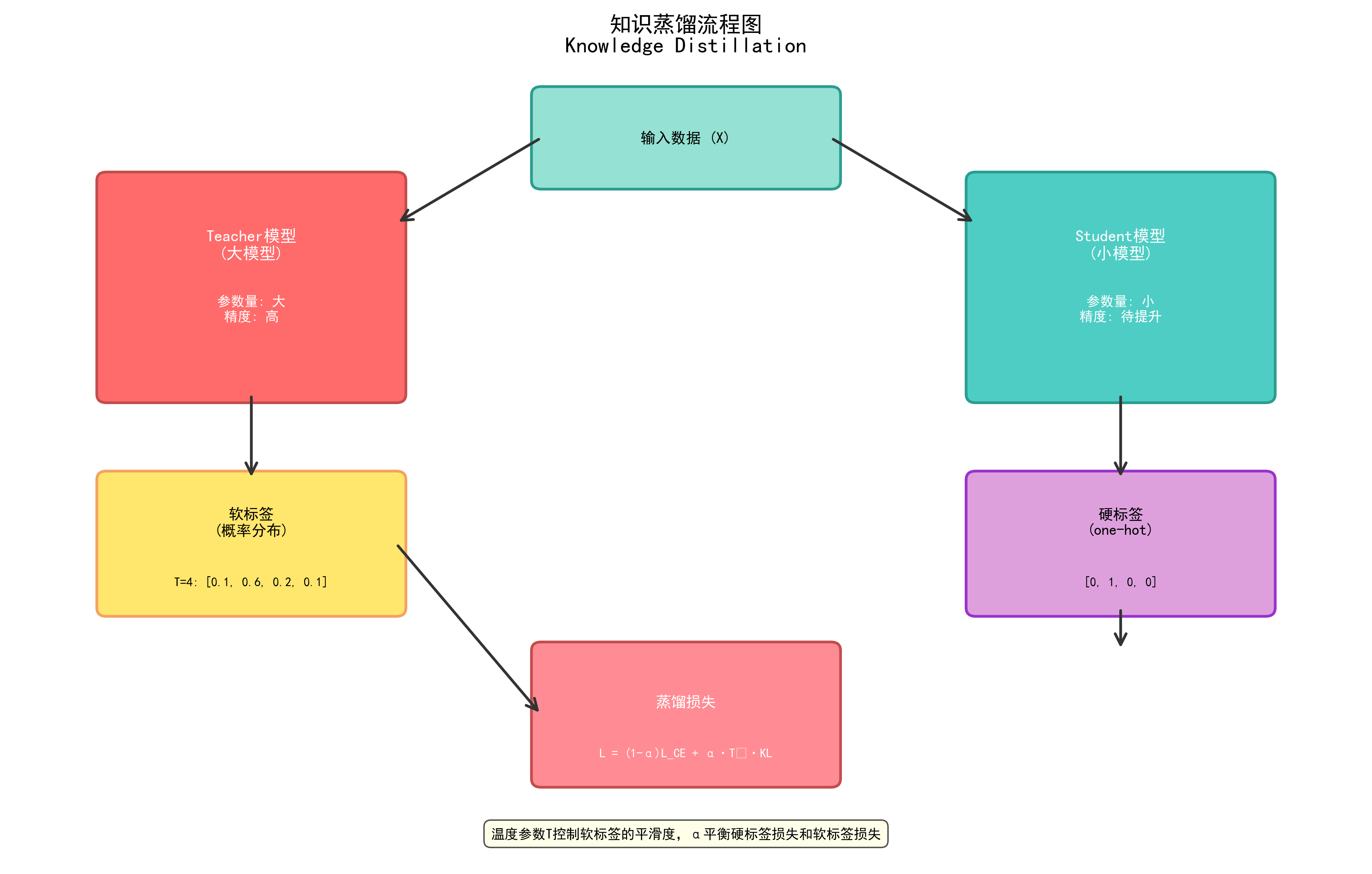 Hinton et al.( 2015 ):用大模型( Teacher )的"软标签"来训练小模型( Student )。