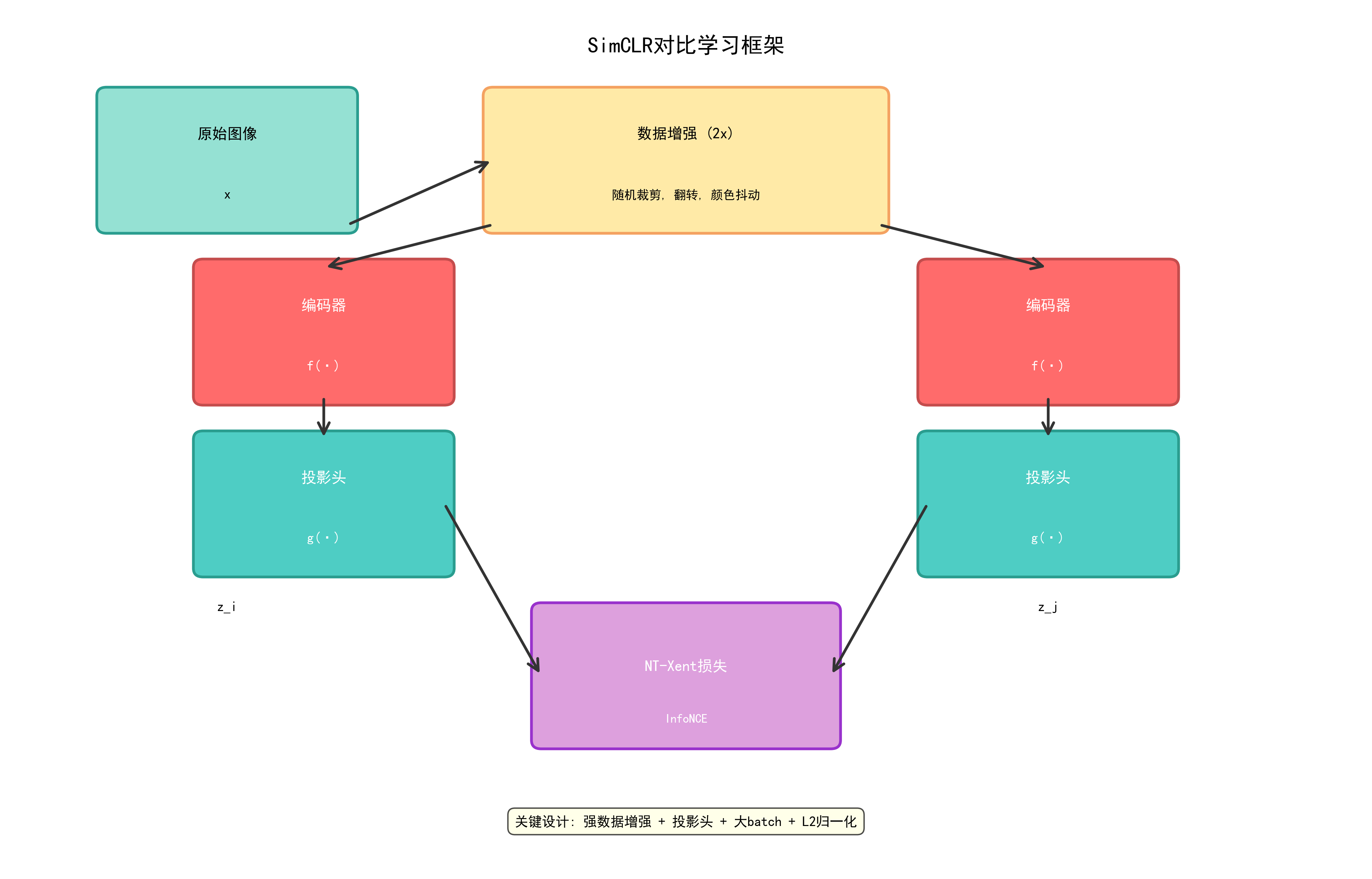拉近同一样本不同增强视图的特征(正对),推远不同样本的特征(负对)。
