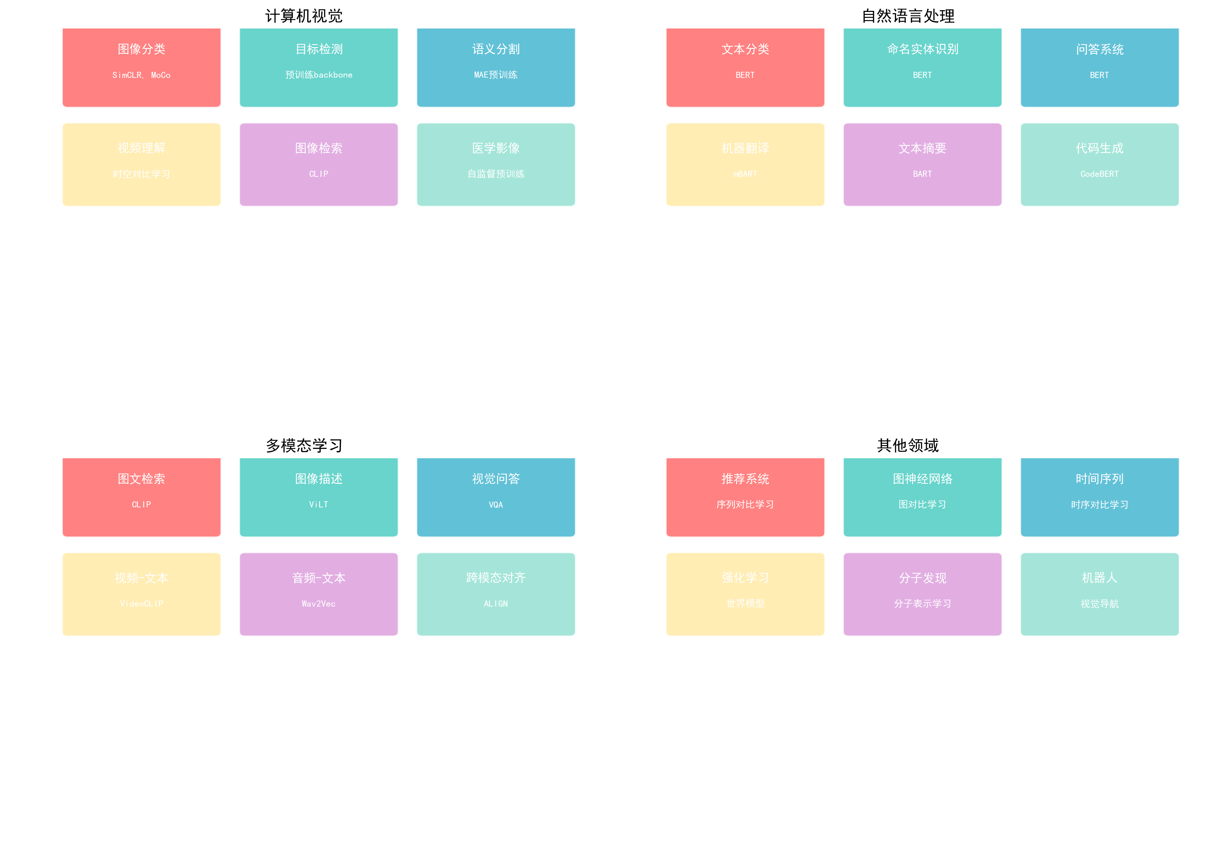 | 自监督学习 | 从数据自身构造监督信号 | SimCLR, MAE, BERT (预训练) |