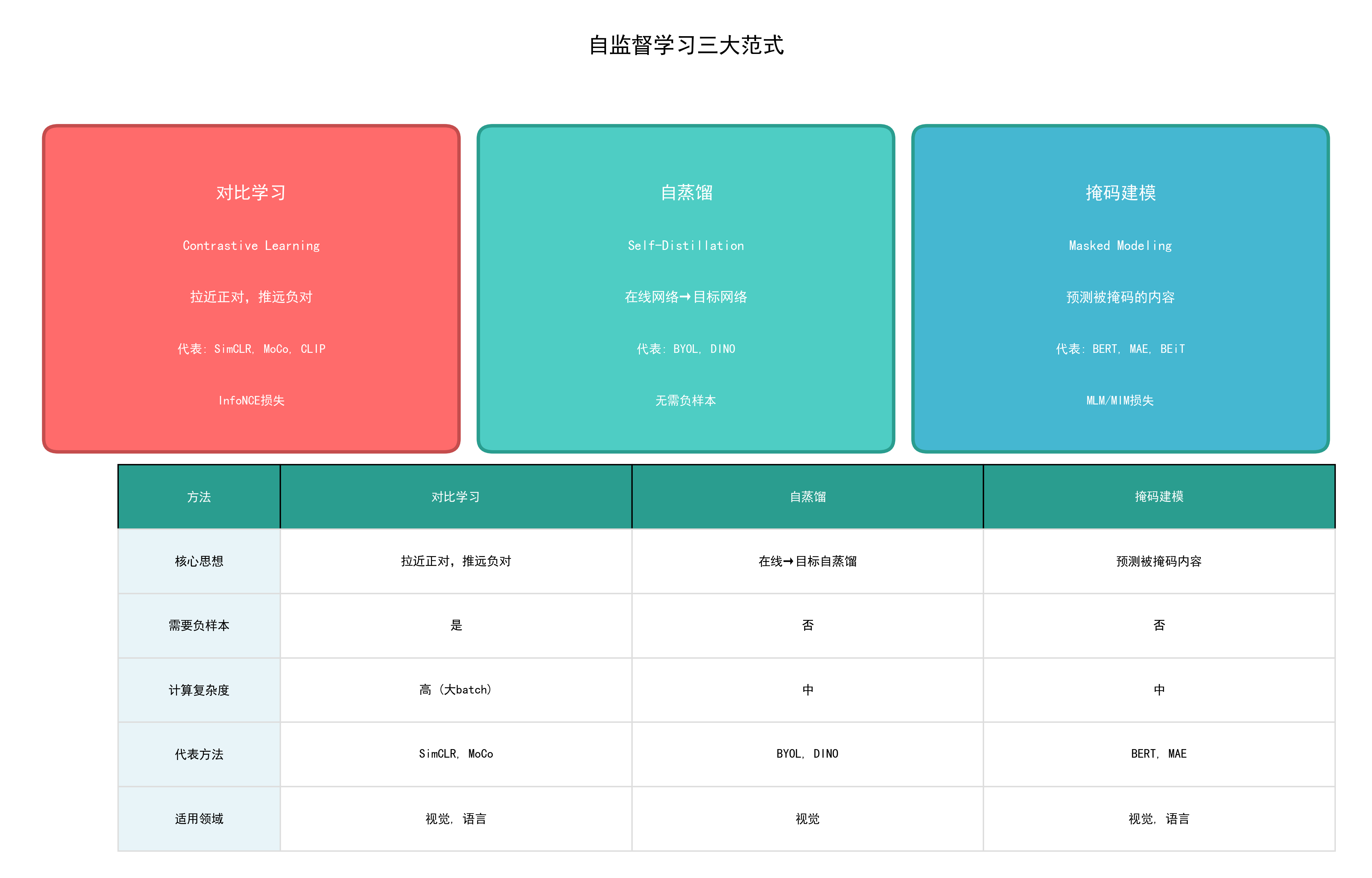 - 能区分对比学习、自蒸馏、掩码建模三种范式