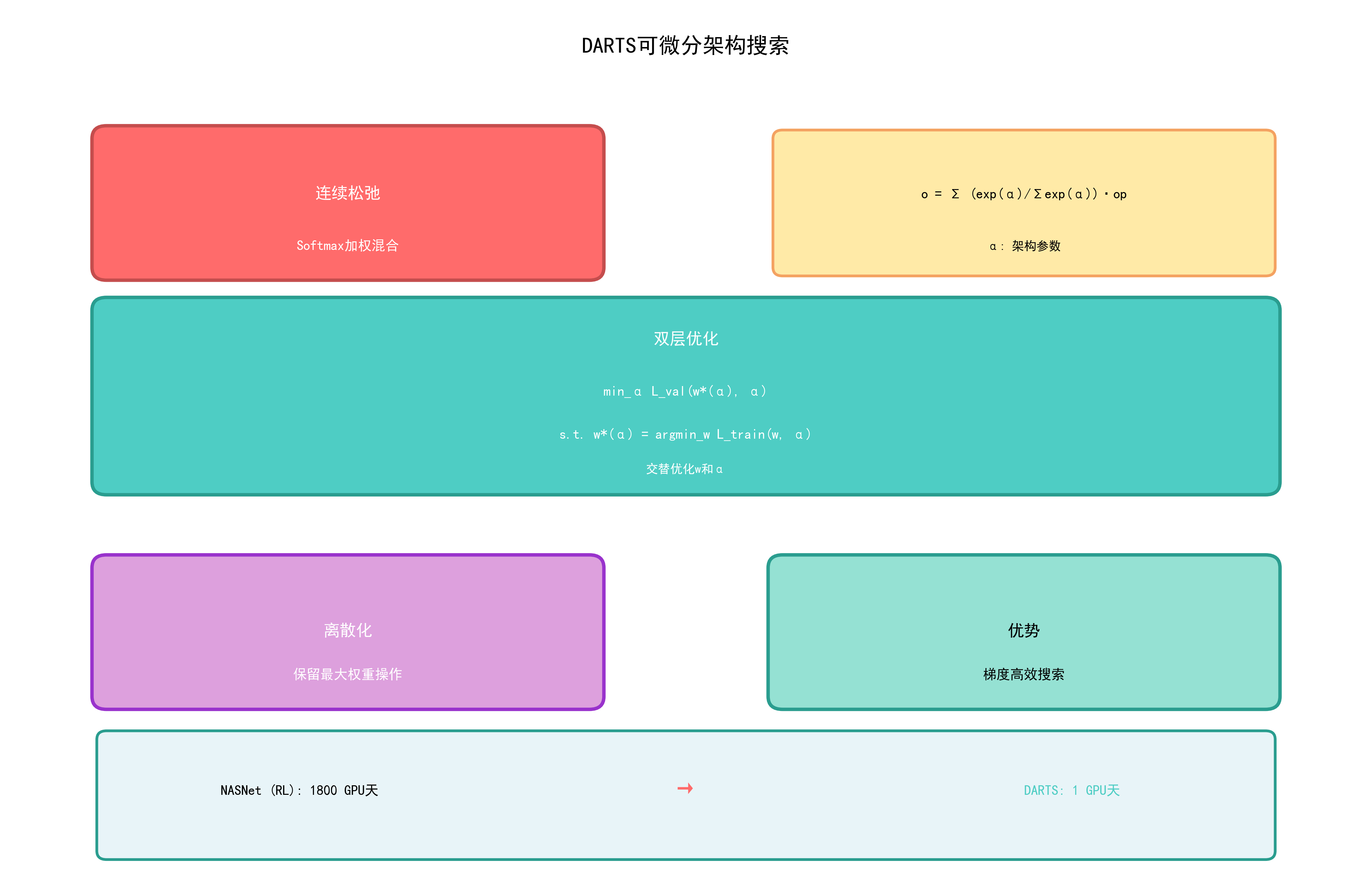 答: DARTS 将离散的架构选择松弛为连续优化问题。在搜索阶段,每条边上所有候选操作通过 softmax 加权混合;通过双层优化交替更新网络权重和架构参数;搜索完成后取每条边上权重最大的操作进行离散化。这样可以用梯度下降高效搜索,将搜索时间从数千 GPU 天降至约 1GPU 天。