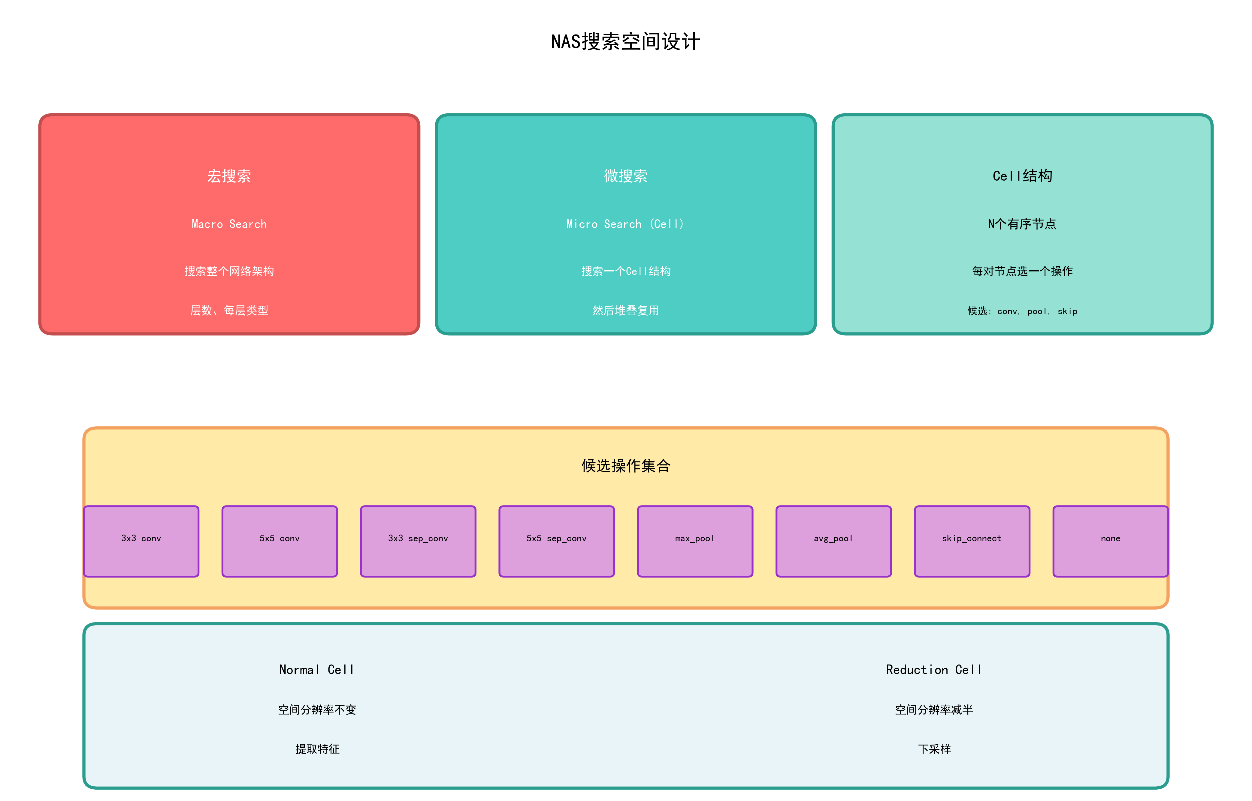 | 宏搜索 | 搜索整个网络架构(层数、每层类型) | 原始 NAS |
