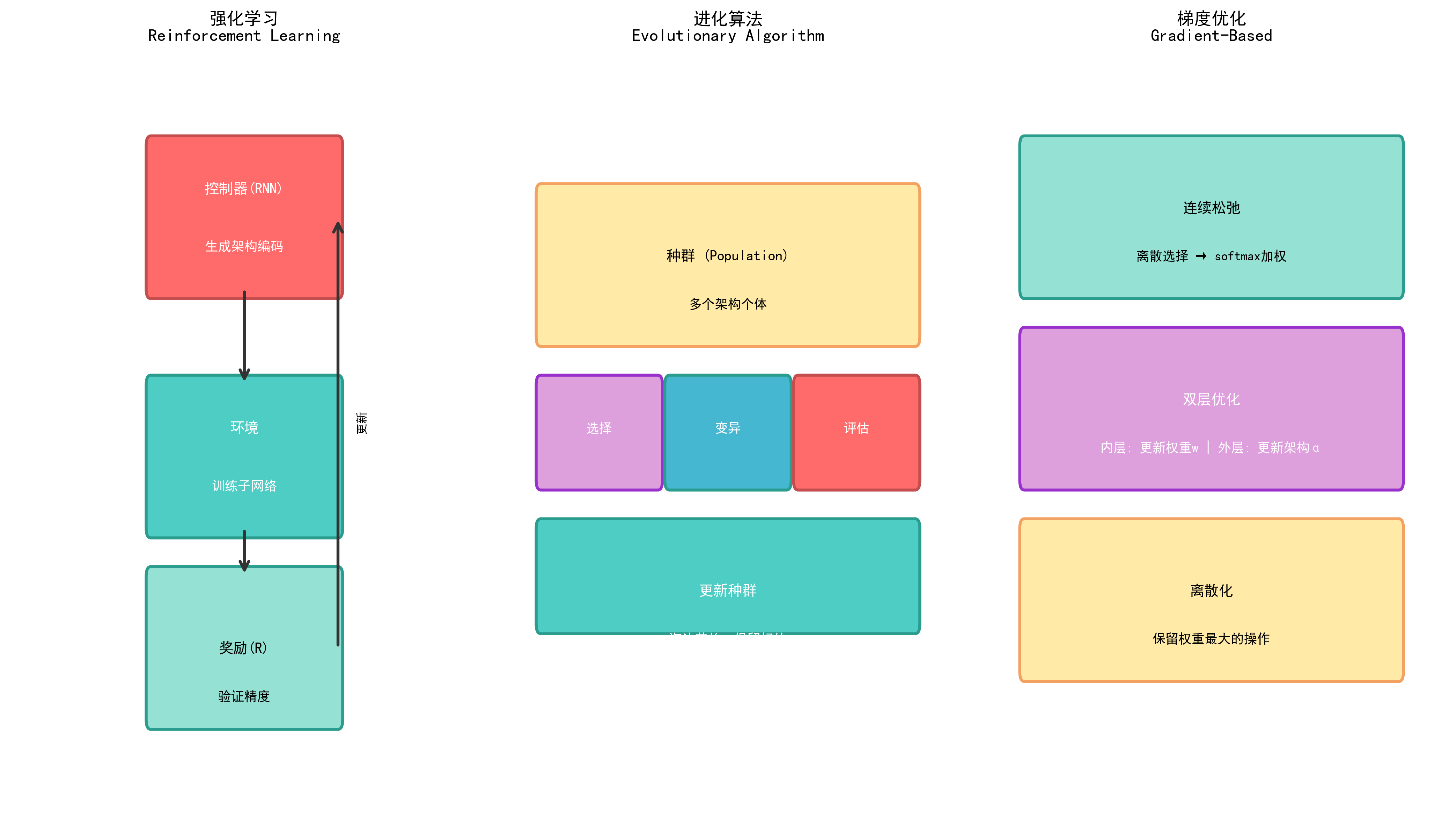 | 搜索空间巨大 | 层数、通道数、连接方式的组合呈指数级增长 |