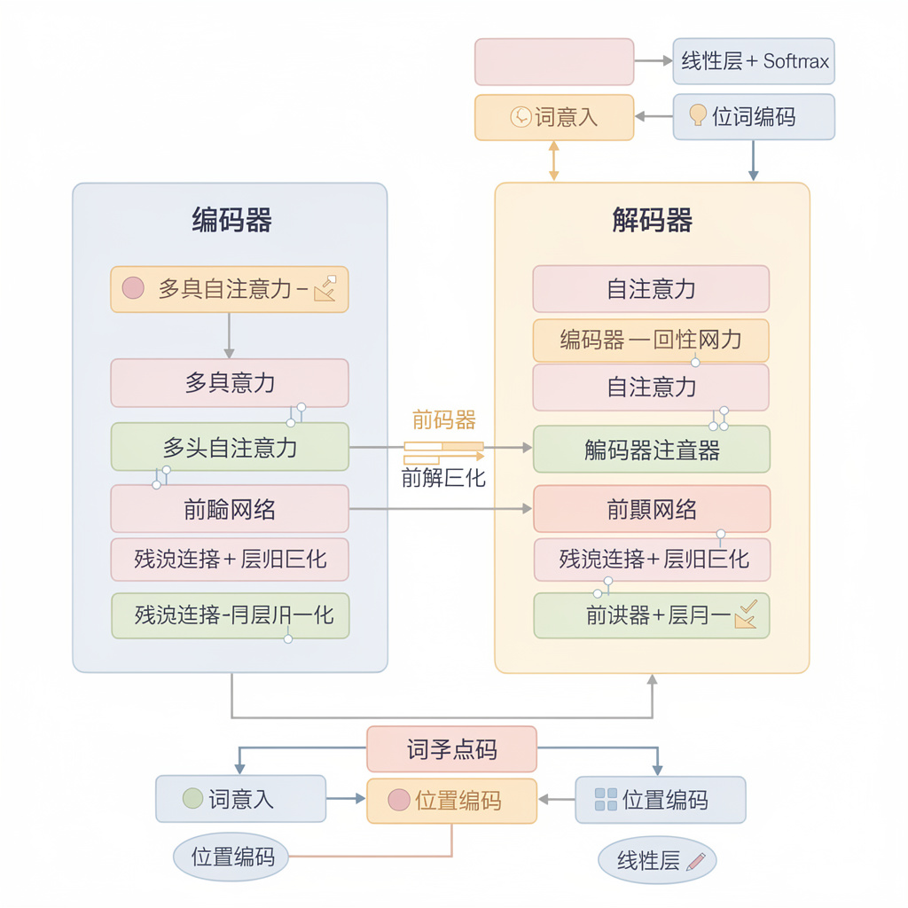 上图展示了 Transformer 的完整架构,包括编码器( Encoder )和解码器( Decoder )的堆叠结构,以及自注意力机制和前馈神经网络等核心组件。